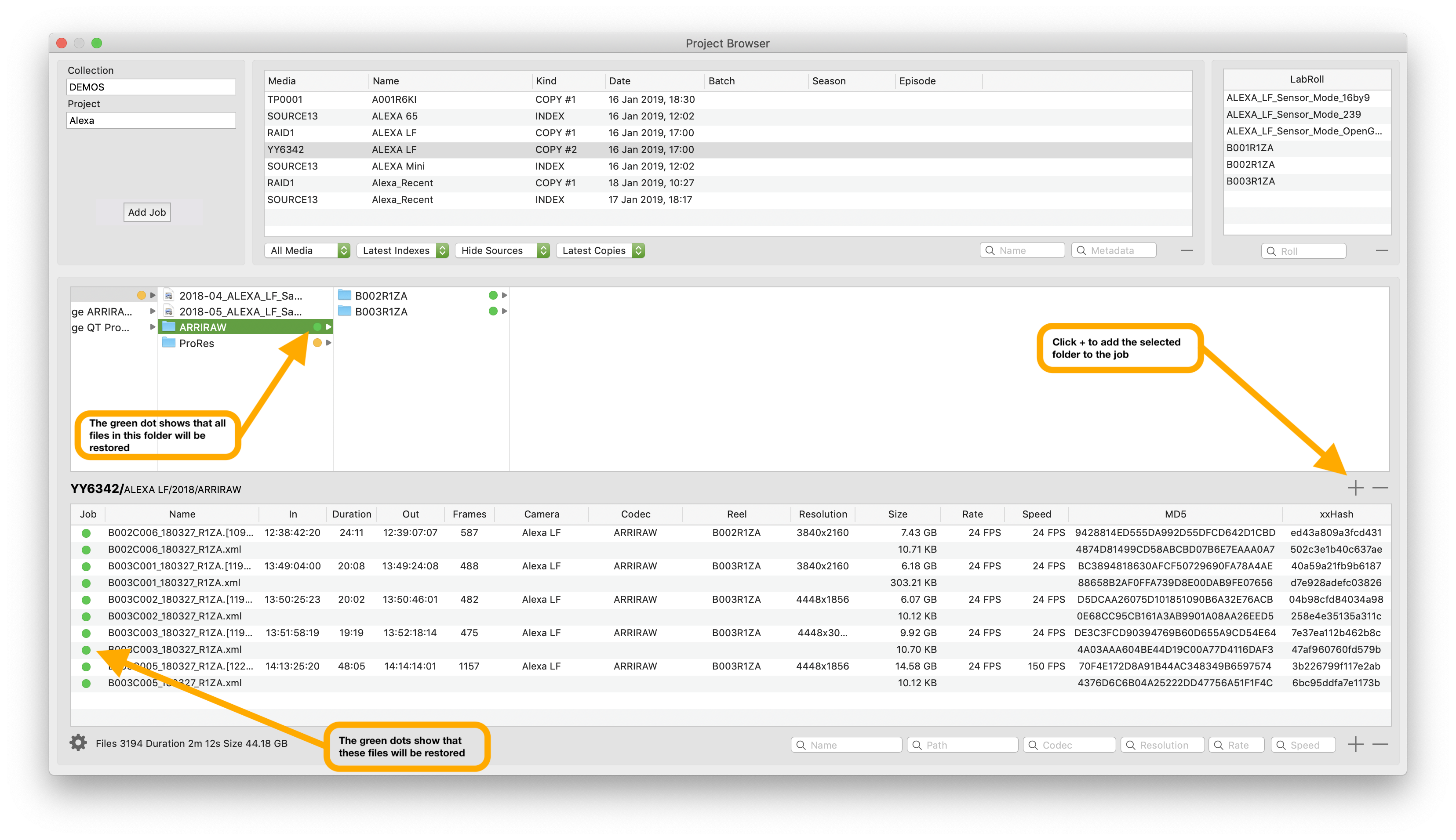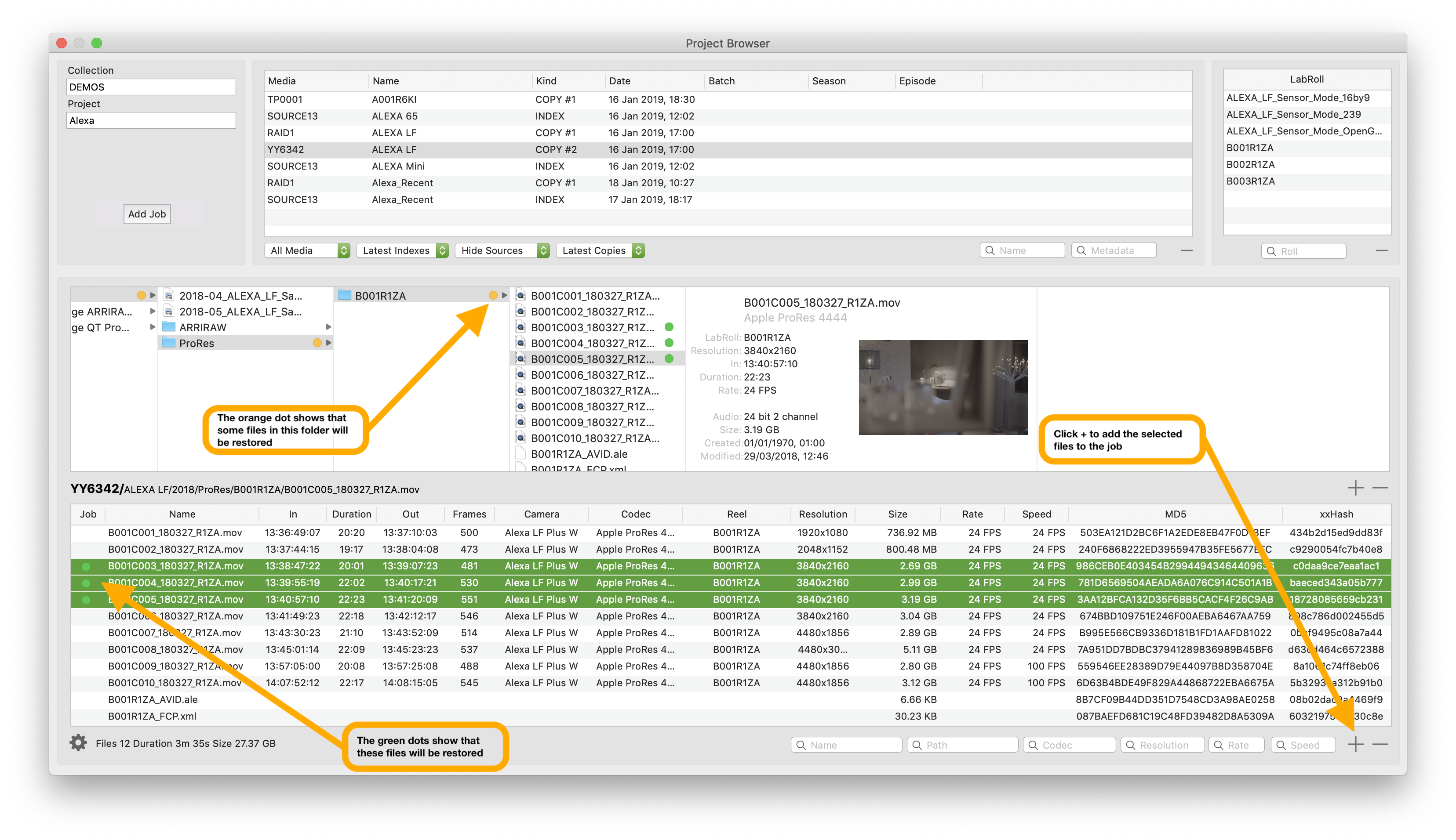 Choose a folder in the Media browser, select some files for restore. Then click the +